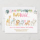 Este convite de aniversário fofo apresenta os animais de safari aquoso com sotaques florais e folhosos e faux gold foil confetti.