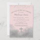Um elegante convite cor-de-rosa e prata Primeira Comunhão com um confete de brilho prateado no topo e um brilho prateado no fundo com uma cruz reluzente prateada.