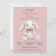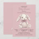 A pink toile bunny rabbit baby girl baby shower invitation featuring a sweet floral patterned stuffed bunny illustration and soft dusty rose typography. The gentle toile pattern gives the bunny a delicate nursery inspired look while the clean rose pink background keeps the design elegant and modern. Centered artwork creates a charming focal point that feels warm, soft, and welcoming for a baby girl celebration. Perfect for a bunny themed baby shower, rabbit themed baby shower, or classic nursery inspired gathering. The simple layout keeps the event details easy to read while allowing the illustrated bunny to remain the heart of the design. Available in print, as a digital download or both.