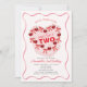 This cute "have your cake and eat it two" girl's 2nd birthday invitation features a vintage heart-shaped cake with cherries and bows. The reverse side features a red background with a delicate bow pattern. Perfect for the Valentine's Day birthday! Personalize for your needs. You can find matching products at my store.