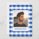 Este retrô "belisque-me, já terminei" convite de festas de marisco/marisco apresenta um lagosta com um boné de formatura rodeado por uma moldura de cinza. O verso apresenta sua foto em um fundo branco com padrões de verificação de gingham azul. Personalize-o para as suas necessidades. Você pode encontrar produtos correspondentes na minha loja.