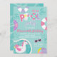 convite de aniversário piscina com piscina de unicórnio flutuante. Púrpura rosa e turquesa.