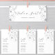 Cartão Floral Moderno de Números de Sentados com Tabelas de Casamento Floral Mínimo Preto e Branco com Nomes de Convidado. Todos os textos estão pré-organizados para que você personalize fácil e rapidamente com seus próprios detalhes.