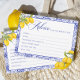 Adicione um toque divertido ao tema principal do chá de panela de aperto com este cartão de aviso personalizado amarelo e azul. Perfeito para uma celebração principal de limão chá de panela espremido, esta carta ajustado lindamente com qualquer tema de chá de panela de limão. Quer você esteja procurando por ideias de chás de panela de temas limões ou ideias de chá de panela de temas italianos de limão elegantes, esta design é uma escolha encantadora. Excelente para as ideias do chá de panela de verão, permite que os hóspedes compartilhem seus melhores desejos e conselhos para a futura noiva!