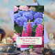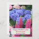 Cartão de Dia de as mães floral bonito com flores e tremoços azul de hydrangea. Este jardim de flores está cheio de lindas flores que a mãe vai amar. Hipóteses azuis púrpuras, florações cor-de-rosa pálido e tremoços cor-de-rosa claro são o fundo de três linhas de texto personalizadas. Inverso é cor de lavanda pálida. Este design também vem como um download instantâneo para compartilhar digitalmente online.
