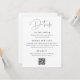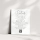 A moderna placa de gabinete tudo em um para seu chá de fraldas contém três campos personalizados para detalhes adicionais; mostrados com um arquivo de fralda, solicitação de livro e código QR de registro. O design preto e branco minimalista chic coordena-se com o nosso pacote de convites para chás de fraldas de Script Minimalista Moderno.