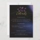 Alguns ramos de folhas de eucalipto, desenhadas à mão em lápis colorido e em camadas com tons de poeirento e roxo escuro, fazem um moderno, sofisticado, elegante e chic cartão de cerimônia de casamento. O fundo azul preto e escuro com pistas de roxo e luzes iluminam o céu da meia-noite. A elegante escrita caligráfica, na matiz do ouro, torna esse design na moda preto e roxo ainda mais elegante.