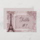 Numere suas mesas de recepção com um cartão de mesa de recepção parisiense rosa. O design de cartão de mesa apresenta a Torre Eiffel, um pergaminho onde você pode detalhar as informações do seu chá de panela enfeitiçado com embelezamentos de damasco e selo postal. Material adicional disponível com esta design também.