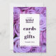 Rosa Roxo Mínimo Moderno Cartões de Chá de panela de Fotografias e Placa Tabletop de presentes Torne seus detalhes de evento pop com esta elegante placa tabletop! Esta placa personalizável 5x7 apresenta um belo pano de fundo de aquarela de rosas roxas românticas, perfeitamente enquadrado por um layout branco limpo. A frente é projetada com um saboroso "Cartões e Presentes" em um script em negrito, juntamente com uma mensagem sincera de "Obrigado", e é personalizada com o nome da noiva-a-ser e as palavras "Chá de panela". Esta bela carta é a forma perfeita de dirigir os convidados para a mesa de presentes. Mas a melhor parte? As costas! É uma canvas maravilhosa para uma fotografia memorável da futura noiva, completa com uma elegante tipografia do seu nome futuro. Isso garante uma exibição sem falhas de qualquer ângulo quando colocada em suportes de cartão, suportes de madeira ou suportes de clipes (não incluídos). Esta manutenção é uma adição impressionante e funcional ao seu evento. Simplesmente personalize com seu nome e detalhes para criar um belo e moderno sinal.