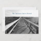 Cartões novos de comunicação de endereços para a costa. As placas planas têm texto e imagens em ambos os lados. Uma imagem de passeio de madeira em preto e branco na frente, com uma linha de texto azul escuro na parte superior. Adicione mais informações à parte de trás da carta sobre uma cena de praia com uma grande carapaça lavada.