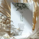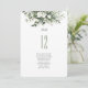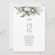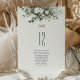 Este cartão numérico da mesa é adornado com um buquê luxuoso de rosas brancas e uma matriz de folhagem verde, que vai desde a fase macia até aos tons de azeitona profundos. Combina graciosamente a funcionalidade com o apelo estético, com um número de tabela proeminente ao lado de uma lista de nomes de convidados. A fonte elegante melhora o aspecto sofisticado da carta, fazer-a como uma adição perfeita a qualquer configuração de mesa de casamento. O design garante que os hóspedes possam encontrar sem esforço seus assentos enquanto são recebidos pelo encanto natural do arranjo floral.