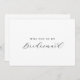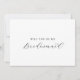 Esta elegante carta de proposta da dama de honra é perfeita para um casamento simples. A design a preto e branco minimalista apresenta tipografia romântica rico com estilo de vidro moderno. Personalizável em qualquer cor. Mantenha o design mínimo e a classe, como está, ou personalize-o adicionando seus próprios gráficos e trabalhos de arte. Personalize a placa com o nome da noiva e da dama de honra. Personalize a parte traseira do cartão com uma mensagem personalizada.