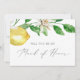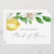 Este moderno cartão de madrinha de casamento de limão é perfeito para um casamento de primavera ou verão. O design mediterrânico rústico apresenta limões aquosos brilhantes e bonitos com flores brancas boêmicas e folhas verdes elegantes. Personalize a placa com o nome da noiva e da madrinha de casamento. Personalize a parte traseira do cartão com uma mensagem personalizada.