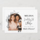 Esta proposta/placa de madrinha de casamento de porta-pontas de foto apresenta um design mínimo e moderno com um arco que contém sua imagem com sua dama de pontas. E um calendário onde você irá adicionar um coração na data com um lápis para adicionar seu próprio toque ao cartão.
