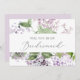 Esta proposta rustica de dama de honra é perfeita para um casamento de primavera ou verão. A romântica e elegante design floral apresenta flores lilás roxas de aquarela com uma sensação de jardim boho country. Personalize a placa com o nome da noiva e da dama de honra. Personalize a parte traseira do cartão com uma mensagem personalizada.