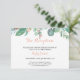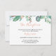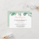 Este cartão de recepção de casamento floral tropical rosa moderno é perfeito para um casamento de destino. A design apresenta lindamente flores brancas, cor-de-rosa e pinceladas pintadas à mão com folhas verdes, representando graça e elegância.