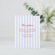 Este cartão de recepção de casamento vermelho e azul é uma na moda para guiar seus convidados para a celebração após a cerimônia. Apresentando listras azuis clássicas e texto vermelho em negrito, ele fornece todos os detalhes essenciais para uma noite de cocktails, janto e dança. Perfeitamente coordenado com o teu convite de casamento.