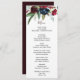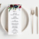 Este cartão de cardápio de janto floral de marinho burgundy moderno é perfeito para um casamento simples. A design apresenta flores vermelhas, burladas, marinhos, roxas, azuis e esbranquiçadas lindamente pintadas à mão e folhas verdes. Este menu pode ser usado para recepção de casamento, janto de ensaio, chá de panela ou qualquer evento.