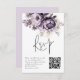 RSVP de Casamento de Código QR do Purple Lilac Florals Convide seus hóspedes a responderem on-line por meio deste pequeno cartão de gabinete. Lindas flores de verão estão no topo. Adicione seu código QR à página de resposta do seu site de casamento. Uma tipografia informal em preto para o título principal RSVP e o resto do texto que pode facilmente personalizar. Também disponível digitalmente.