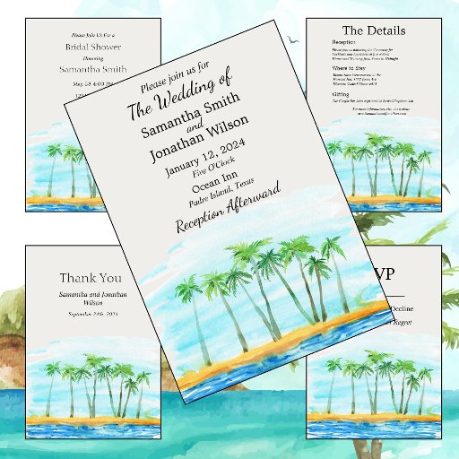 Você está sonhando com um casamento de destino? A coleção Palm Tree and Beach Wedding Invitation é para você! Talvez um casamento tropical durante o verão ou um casamento na praia. Esta coleção de boho colocará seus hóspedes no humor para Oceano e areia em um local costeiro ou apenas um casamento sobre temas tropicais.
