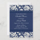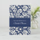 Convites de chá de panela em azul marinho escuro elegante e natas em cor damasco floral branca, elegante e feminina, personalizáveis com seus detalhes de chá. Também disponível em cartões de agradecimento e convites para a festa noiva.