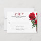 Cartão de resposta de rosebuds vermelhos. Os cartões brancos com texto preto impresso têm uma redação simples e tradicional de RSVP. A rosa vermelha real é feita com verde decorando a borda direita das cartas. Inclua uma linha para os convidados darem uma contagem para obter um número de convidado exato. Ou mude o texto para sua preferência. O reverso é vermelho sólido.