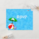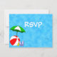 Um modelo de cartão RSVP de praia ou piscina editável com uma bola de praia e um guarda-chuva de um lado e quarto para seu endereço de retorno e informações de convidado no verso em letras divertidas.