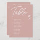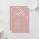 Cartões de Gráficos de Mesa de Casamento Cor-de-Rosa Blush Moderno são o toque perfeito para a sua recepção de casamento. Direcione seus convidados para seus assentos com este quadro único. As placas são perfeitas para pendurar ou exibir em um conselho ou parede. O design apresenta uma fonte de script mínima com san serif elegante em branco em um fundo de rosa claro. A design é impressa em ambos os lados.
