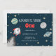 Convite de aniversário para o tema do espaço externo para a celebração do seu filho. A ilustração tem alguns planetas, estrelas e um foguete. Ilustrada e projetada por Patricia Alvarez.