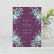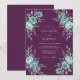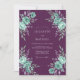A sophisticated deep plum backdrop sets a mysterious and romantic mood. Vibrant teal roses and mint green blossoms are arranged in lush clusters. Delicately shaded lavender leaves and foliage add an ethereal touch to the botanical display. This palette of dark jewel tones creates a striking contrast for a formal event.