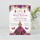 Elegante aquarela Princesa cabeleira loira em design de roupas roxas de ameixa com flores roxas e douradas, borboletas e confete de ouro.
