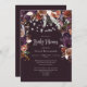 Concurso de Chá de fraldas leve de Corda Floral Dourada, ameixa. Este maravilhoso convite de chá de fraldas é perfeito para seu evento especial! Este design apresenta lindas, ricas plumas, roxas, rosa e douradas flores em um fundo de ameixa com luzes de cordas mágicas. A tipografia personalizada é moda e elegante!