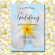 Um design floral suave e delicado com uma flor branca de Plumeria Havaiana sobre fundo azul macio. Um pacote de convite perfeito para o casamento na praia, casamento havaiano, casamento de destino na ilha tropical e muito mais. O significado havaiano para a flor da Plumeria é "novos começos" e "positividade". Ambos perfeitos para o novo começo de uma relação casada.