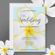 Um design floral suave e delicado com uma flor de Plumeria havaiana branca e amarela sobre fundo azul macio. Um pacote de convite perfeito para o casamento na praia, casamento havaiano, casamento de destino na ilha tropical e muito mais. O significado havaiano para a flor da Plumeria é "novos começos" e "positividade". Ambos perfeitos para o novo começo de uma relação casada.