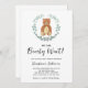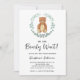 Convite para chás de fraldas com tema de urso bonito, com ilustração pintada à mão de um filhote com cor d'água eucalipto verde. O texto diz "Podemos esperar muito!" na tipografia da na moda. Excelente de um chá neutro em termos de gênero. Facilmente personalizável. Original Watercolor © Michele Davies.