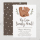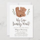 Chá de fraldas com tema de ursos bonitos, com ilustração pintada manualmente de um filhote com folhas verdes. O texto diz "podemos esperar muito!" Este convite é excelente de um chá neutro em termos de gênero no outono.