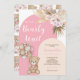 Celebre a chegada com este encantador Convite para Chás de fraldas de Menina "Nós Podemos Esperar". A design apresenta um urso doce segurando um punhado de balões cor-de-rosa e castanhos, emoldurado por um arco na moda cor-de-rosa e castanho. Destacado com delicados elementos florais cor-de-rosa e erva-pampas. BBS406