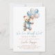 O convite para chá de fraldas Trendy Blue Boy com ursinho de pelúcia fofo com balões de pastel azul e castanho, a frase "É um menino" e azul pastel no fundo. Itens correspondentes disponíveis.