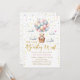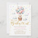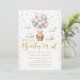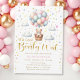 Podemos esperar o convite de chá de uma menina. Urso de pelúcia bonito flutuando em uma cesta com balões cor-de-rosa e azuis no céu.