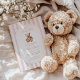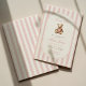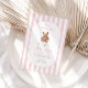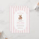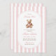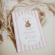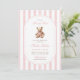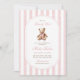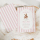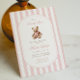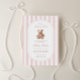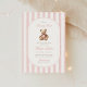 Um doce acento à tradição com um toque de charme de eterno. Este convite para o chá de fraldas do milênio apresenta listras de aquarela cor-de-rosa macia, um ursinho de pelúcia estilo vintage, e tipografia elegante — perfeita para celebrar uma mocinha a caminho.