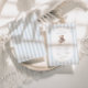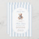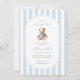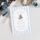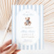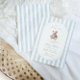 Um doce acento à tradição com um toque de charme de eterno. Este convite para o chá de fraldas do milênio apresenta listras de aquarela azul macia, um ursinho de pelúcia estilo vintage, e tipografia elegante — perfeita para celebrar um pequeno cavalheiro no caminho.