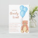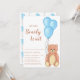 O convite para o chá de fraldas deste rapaz é decorado com um ursinho de pelúcia e balões azuis. O texto marrom diz "We Can Barly Wait" na tipografia de na moda. Facilmente personalizável. Original Watercolor © Michele Davies.