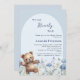 Podemos esperar Chá de fraldas. Um fundo azul claro com um arco. Decorado com flores silvestres de cor aquática em azul e um ursinho feliz.