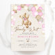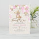 Podemos esperar o convite de chá de fraldas de garotas de sexo. Design de tendências em cores cor rosa, bege e cinza neutra. Apresenta ursinho de pelúcia agudo, letra de guião de balões e estrelas. Perfeito para uma elegante celebração de chá estilo boho. Personalize com seus próprios detalhes. Impressos convites Zazzle ou modelo de impressão digital instantânea para download.