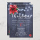 Estilo tradicional, elegante, azul de inverno, vermelho e branco, empresa de Natal aberta modelo de convite à casa à noite na marinho azul-escuro madeira como fundo com cor d'água, vermelho sazonal e flores de poinsettia verde e cordas de luzes cintilantes. +++++++++++++++ Personalize com seus detalhes! Você pode personalizá-lo alterando ainda mais as fontes e as cores das letras. +++++++++++++++++ O convite é adequado para feriados de inverno festas cásicas inspiradas no país rústico ou para a casa aberta da empresa.