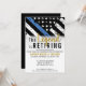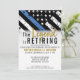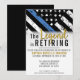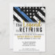 Este design apresenta uma bandeira da polícia com listras pretas e brancas, e uma fina faixa azul de linha também. O texto "A lenda está se aposentando" em ouro se senta acima de todos os detalhes partidários para os detalhes do polícia aposentado, xerife, capitão ou chefe do partido aposentado.