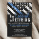 Este design apresenta uma bandeira da polícia com listras pretas e brancas, e uma fina faixa azul de linha também. O texto "A lenda está se aposentando" se senta acima de todos os detalhes partidários para os detalhes do polícia aposentado, xerife, capitão ou chefe do partido aposentado.