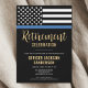Este design apresenta uma bandeira da polícia com listras pretas e brancas, e uma fina faixa azul de linha também. O texto "A lenda está se aposentando" fica acima de todos os detalhes do partido para o polícia aposentado, xerife, capitão ou chefe do partido de aposentadoria.
