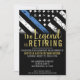 Este design apresenta uma bandeira da polícia com listras pretas e brancas, e uma fina faixa azul de linha também. O texto "A lenda está se aposentando" do ouro fica acima de todos os detalhes partidários para os detalhes do polícia aposentado, xerife, capitão ou chefe do partido aposentado.
