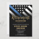 Este design apresenta uma bandeira da polícia com listras pretas e brancas, e uma fina faixa azul de linha também. O texto "A lenda está se aposentando" fica acima de todos os detalhes do partido para o polícia aposentado, xerife, capitão ou chefe do partido de aposentadoria.